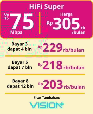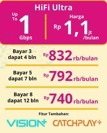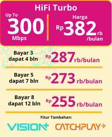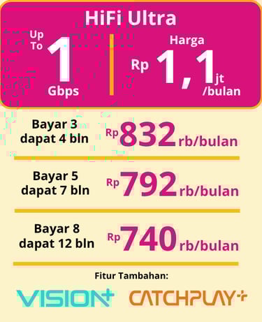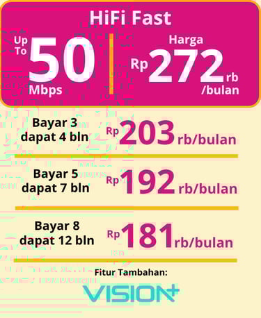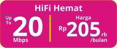 Kami menyediakan layanan pemasangan WiFi Indosat HiFi dengan promo menarik dan paket harga kompetitif. Dengan jaringan fiber optic berkecepatan tinggi, kami memastikan koneksi stabil untuk kebutuhan kerja dari rumah, sekolah daring, dan streaming. Tim teknisi profesional kami siap melakukan survei lokasi, pemasangan perangkat, serta konfigurasi jaringan agar koneksi langsung optimal. Hubungi kami untuk pemasangan cepat dan dukungan 24/7.